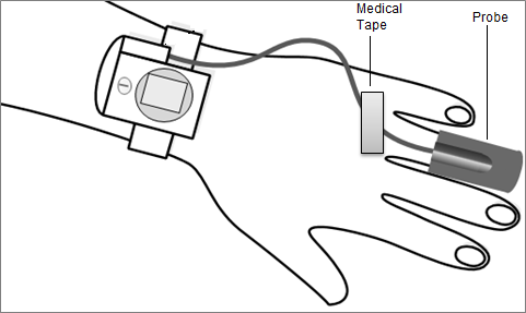 - Place the probe on the finger (cable facing the back of the hand), then use a cloth probe cover over top of the probe to hold it in place.